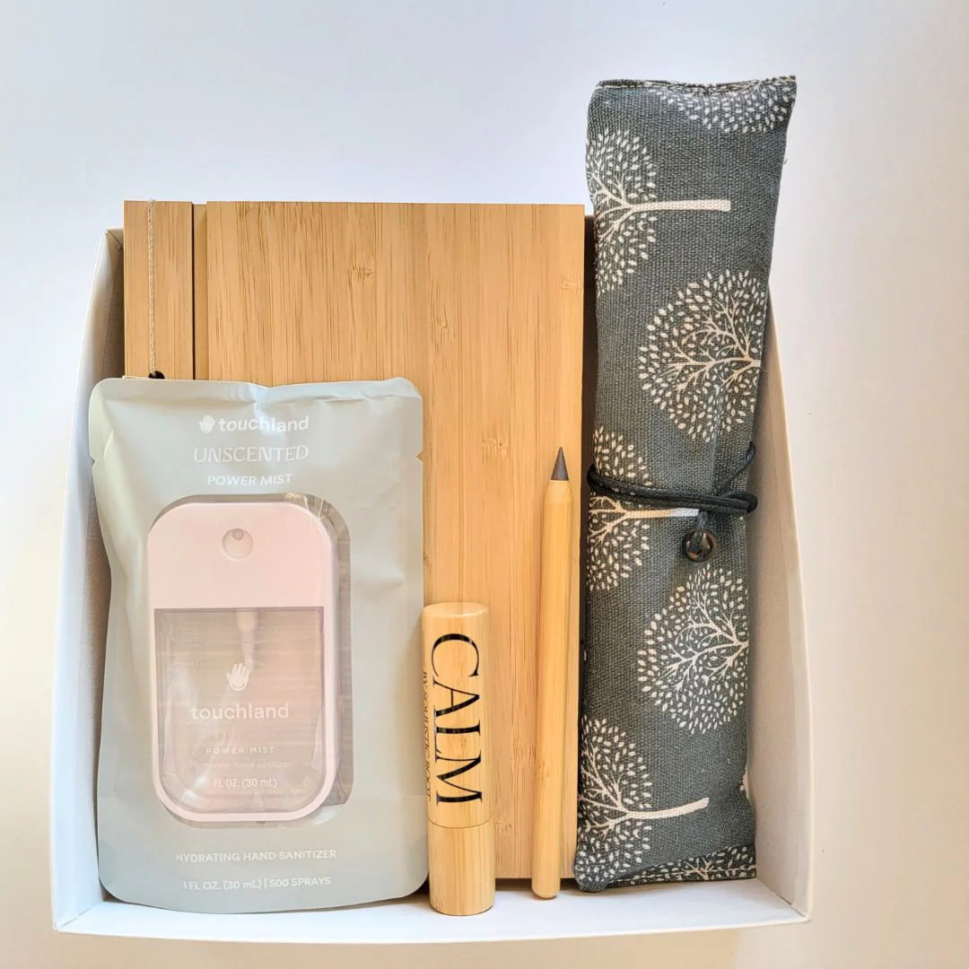 Enhance your workspace with our Sustainable Office Essentials Gift Box, designed for the environmentally conscious professional. This kit includes a bamboo notebook perfect for jotting down ideas, an innovative never-ending bamboo pencil, eco-friendly coconut travel cutlery for meals at the office, a nourishing bamboo tube lip balm, and an unscented Touchland hand sanitizer to keep your hands clean and hydrated. Ideal for office employees and coaches who value sustainability and practicality.