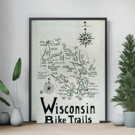 - Hand-drawn artwork showcasing Wisconsin's best bike trails